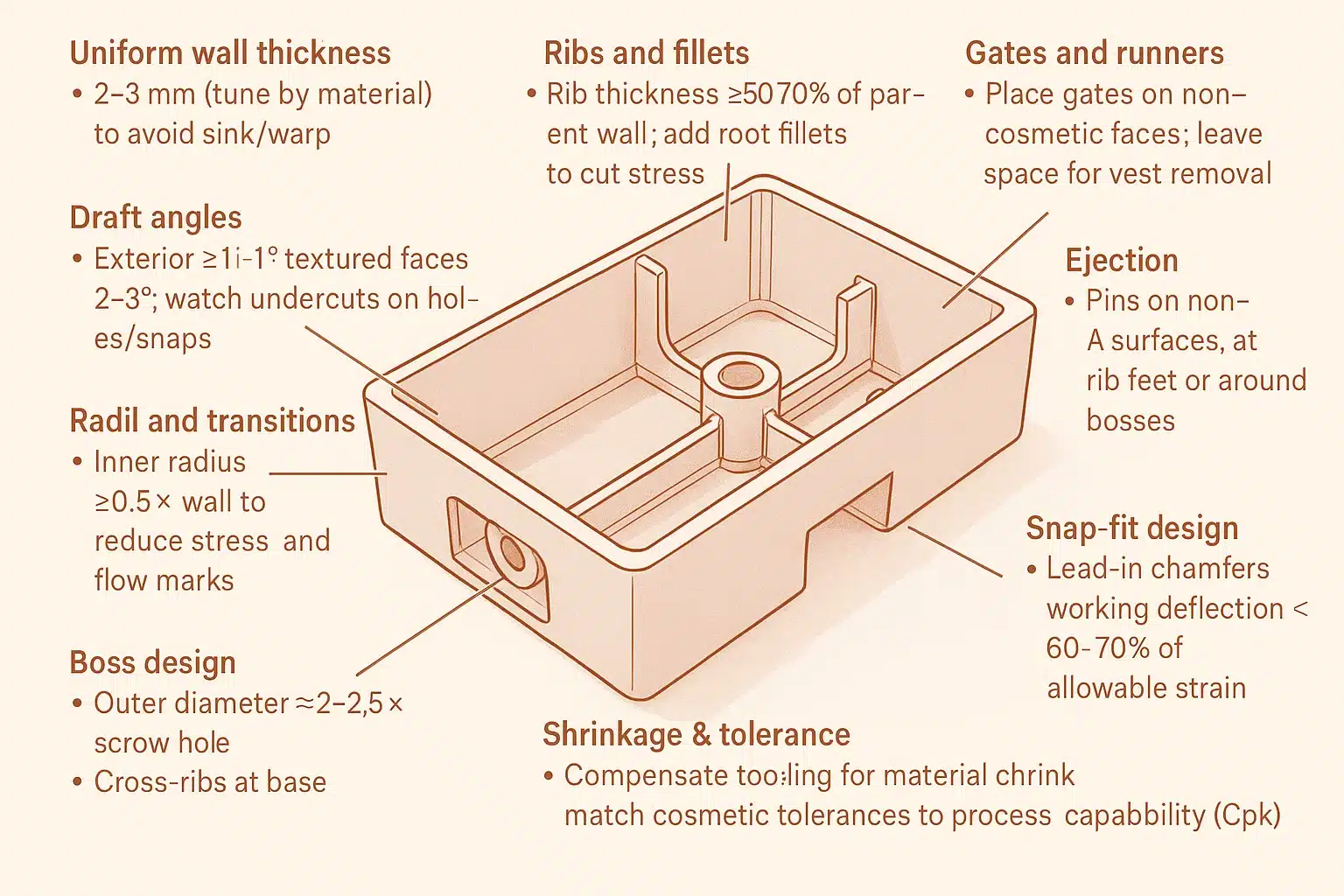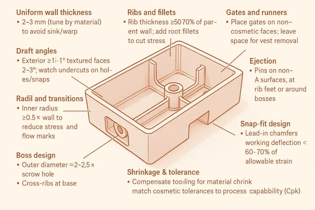 - Radii and transitions: Inner radius ≥0.5× wall to reduce stress and flow marks