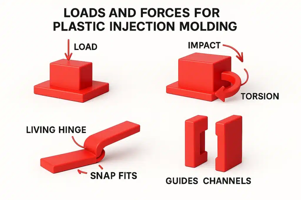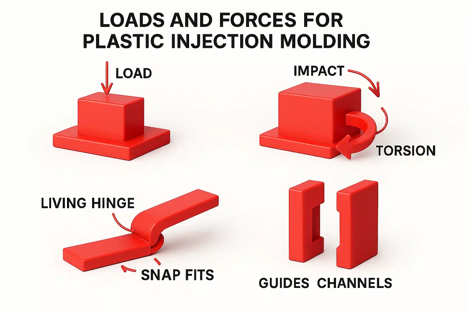 - Loads and forces: How much load? Impact/torsion? Need living hinges, snap fits, guides, channels?